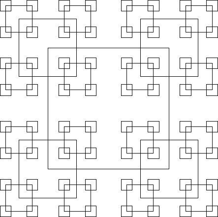 因此,給你一個k值,根據以上的規則,我們可以畫出一個唯一的圖案。而螢幕上的每一個點可能落在0個或多個正方形中。(我們定義若點剛好落在邊上,亦視為落在此正方形中)。所以如果最大的正方形的k=15,我們可以畫出以下的圖案: