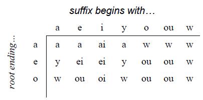 根字以a, e, o結尾( 對應到表左方 ),後綴字已a, e, i, y, o, ou, w開頭( 對應到表上方 ),縮寫的結果在兩母音的交界處,例如:a+o=w