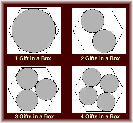 當你要買禮物送給某人時,你也會希望裝禮物的盒子也能漂亮。所以禮物盒子是一件重要的事。現在讓我們回到主題:看以下的圖,分別表示出放置1、2、3、4個同樣大小圓形的禮物在1個正6角行的盒子中。