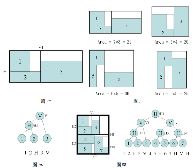師傅想到用樹狀圖來計算最小面積的小蛋糕擺法,以圖一為例,此擺法的二元樹狀圖如圖三所示,每個內部節點(internal node)旁邊的符號是相對於圖一裡的切蛋糕切法。針對樹狀圖的節點作後置順序拜訪所得到節點次序如圖三所示。圖四左圖中最外層由最粗線寬所圍繞的矩型為蛋糕烘培時的面積,經過六刀(例如H1,V1,V2,H2,H3,H4)的切割後,形成7塊各自獨立小蛋糕,切割的流程可用二元樹來表示,圖四右圖下方的表示式為對此二元樹作後置順序拜訪所得到的節點次序,注意此樹狀圖的中間節點只能是H或V,代表蛋糕切法只能是垂直切或是水平切,而所有的小蛋糕都是落在樹葉節點(leaf node)。因此本問題的輸入為一後置順序拜訪所得到的樹狀圖節點次序與每個小蛋糕的大小尺寸,你必須在兩秒鐘之內幫蛋糕師傅算出所須最小的烘培蛋糕面積,所算出的面積不是最小或者是超過十秒鐘才算出答案者都要算失敗沒有通過測詴。