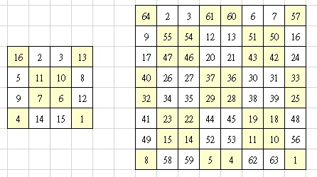 例如4階如左下表、8階如右下表,其值如下,4階每一橫列、直行的和 都是 34 , 8階每一橫列、直行的和都為260 https://i.imgur.com/QIYITpJ.jpg