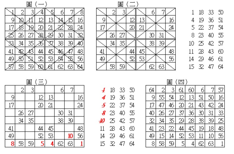 (2) 每方形16格,分成4x4的子區域,每個子區域劃出對角線,將有劃線的數字 1 4 5 8 10 … 61 64 移出如下