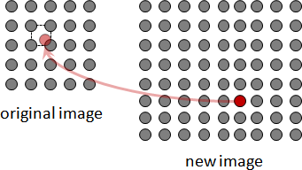 採用反推回去的方式。針對新圖片的一個像素座標,逆向縮放座標。然後找出鄰近四個像素,進行內插。
