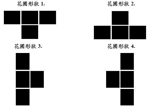 有一位花農他擁有一塊非常大的田地,他非常深愛著老婆 ,打算在今年的情人節種出一整園玫瑰花圃 討他老婆歡心。 老婆聽聞此事後出了道難題給 他,希望每塊玫 瑰花圃 能依照他 喜歡 的形狀來 種植 ,也就是 T字型的花圃 。花圃有4種圖形 如下圖所示 :