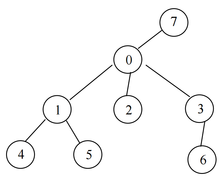 0 是 7 的孩子, 1、2 和 3 是 0 的孩子, 4 和 5 是 1 的孩子, 6 是 3 的孩子。