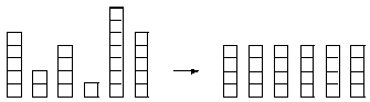 3歲的小明喜歡玩他的方塊積木,他總是把方塊疊在一起形成高度不一的方塊堆。然後他說:這是一面牆。5歲的姊姊小美聽到了就跟小明說:真正的牆高度應該要一樣才行。小明聽了覺得有道理於是決定要搬動一些方塊使所有方塊堆的高度一樣。如下圖。由於小明是個懶惰的小孩,他想要搬動最小數目的方塊以達成這個目的,你能幫助他嗎?