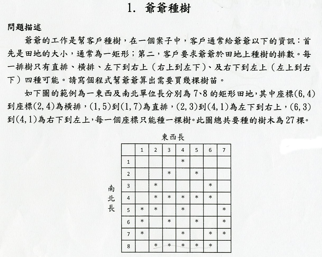 測試資料第一列為土地的東西及南北單位長(1<n,m<=500),第二列是共種幾排樹(1<=t<=500)。以下每列分別為各排樹的起點及終點座標。
