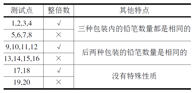 上表中“整倍数”的意义为:若为“V”,表示对应数据所需要的铅笔数量n—定是每种包装铅笔数量的整倍数(这意味着一定可以不用多买铅笔)。