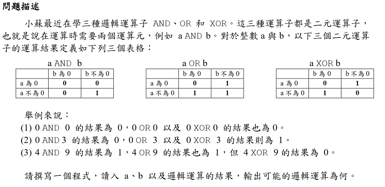 輸出可能得到指定結果的運算,若有多個,輸出順序為AND、OR、XOR,每個可能的運算單獨輸出一行,每行結尾皆有換行。