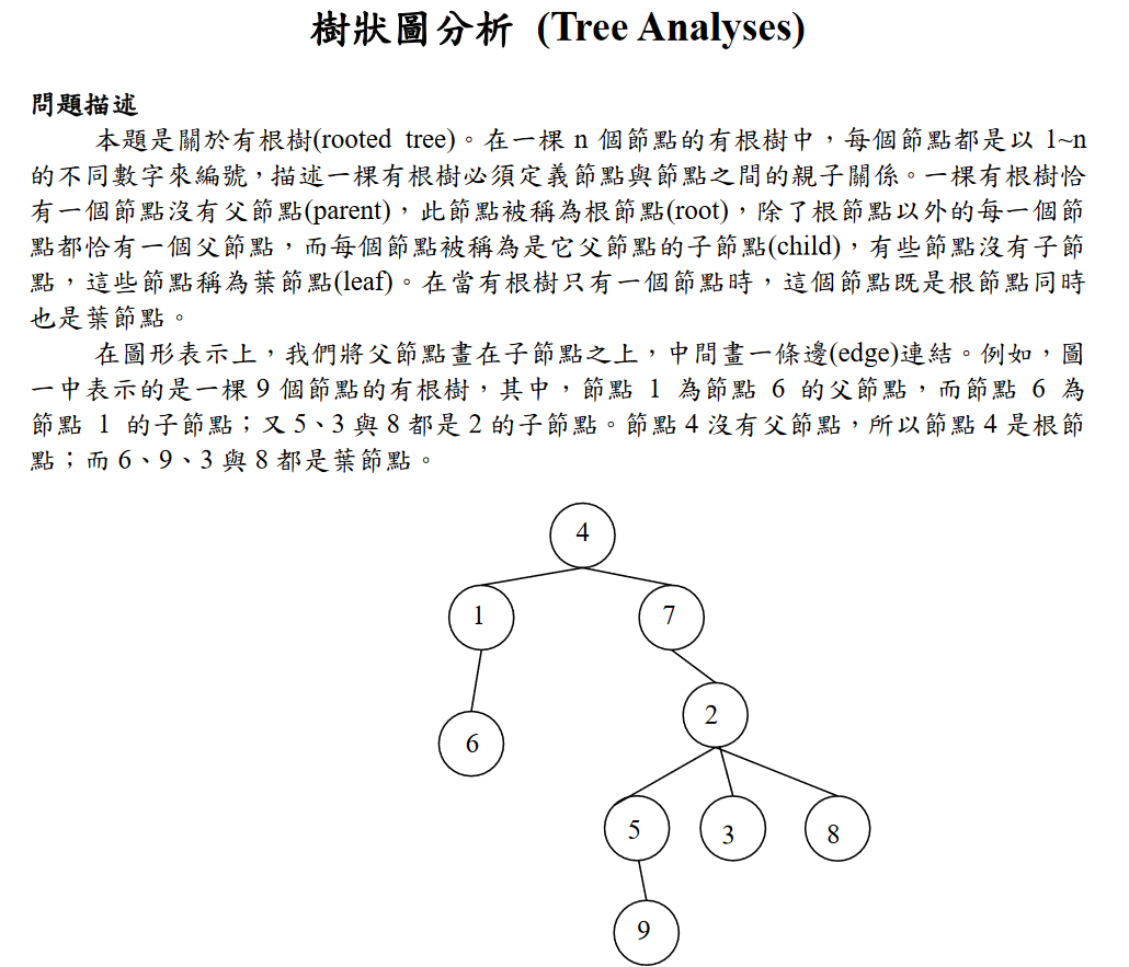 第一行有一個正整數n代表樹狀圖的節點個數,節點的編號為1到n。