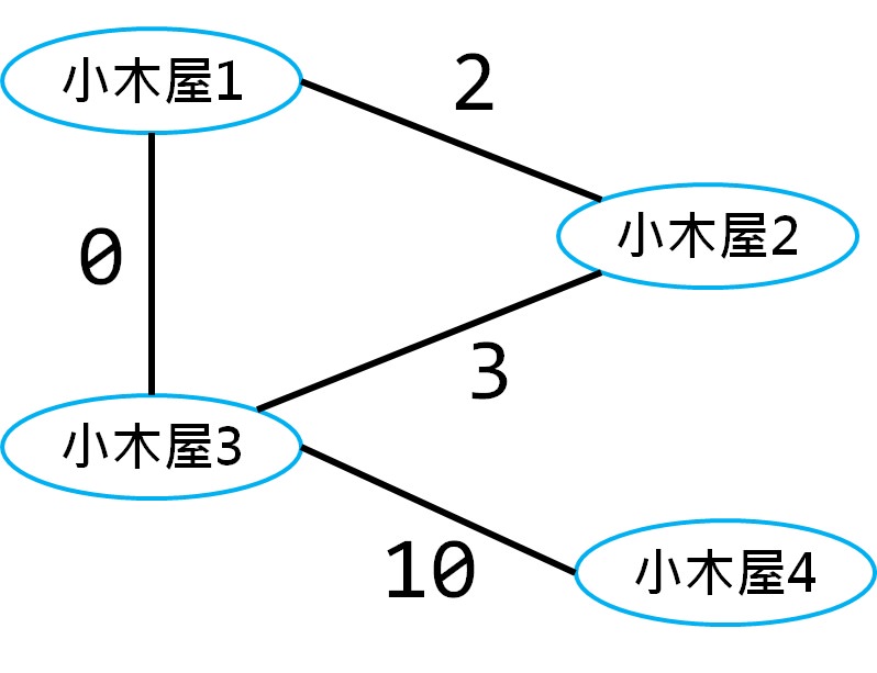 前 2 個正整數代表此小路所連接兩間小木屋的編號(編號小的在前),