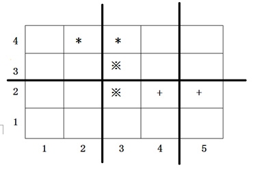 上图中用符号*、※、+标出了3对会交头接耳的学生的位置,图中3条粗线的位置表示通道,图示的通道划分方案是唯一的最佳方案。