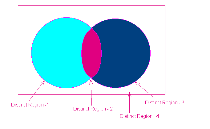 Raju 剛獲得大學理學士的學位。他出社會的第一個工作是到某地區調查該地被劃分為多少塊不同的區域。他發現那裡的人用圓來畫區域,每 2 個圓一定相交於 2 點且不會有三個圓相交於同一點。由於人數實在太多了,Raju 需要你的幫忙計算出這些圓把這地區切割成多少塊不同的區域。以下的圖為 2 個圓的情況,共有 4 個不同的區域。