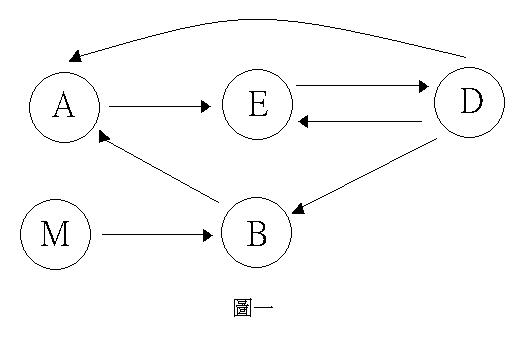 以圖一為例,有五個節點(編號 A,E,D,B,M)和7個連結(AE,ED,DE,DA,DB,BA,MB),其中有三種大小不同的迴圈存在,例如:A→E→D→B→A(此迴圈的連結個數為4),D→A→E→D(此迴圈的連結個數為3),E→D→E(此迴圈的連結個數為2)。你的任務就是要寫一個程式來偵測一個圖形是不是有迴圈,並且列出最短迴圈的連結個數。以圖一為例,最短迴圈的連結個數為2。