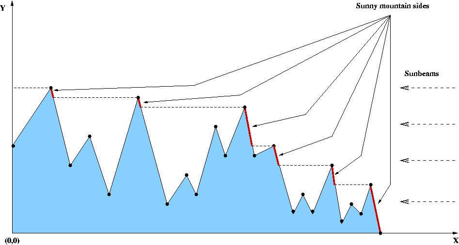為了簡化問題,假設太陽下山時陽光 (Sunbeams)是水平的,地形則是以山巔及山坳的座標表示。如下圖 所示,地形是一連串的山巔及山坳,山巔及山坳會交錯出現。
