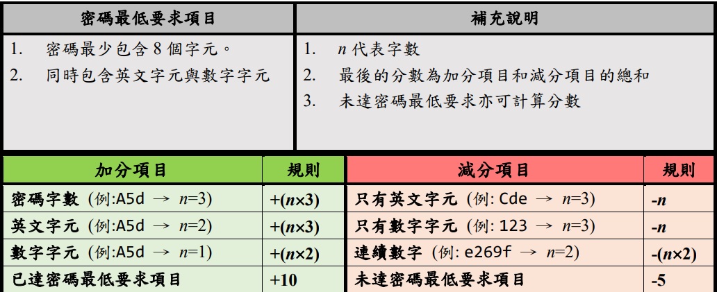 已達密碼最低要求項目 +10 未達密碼最低要求項目 -5