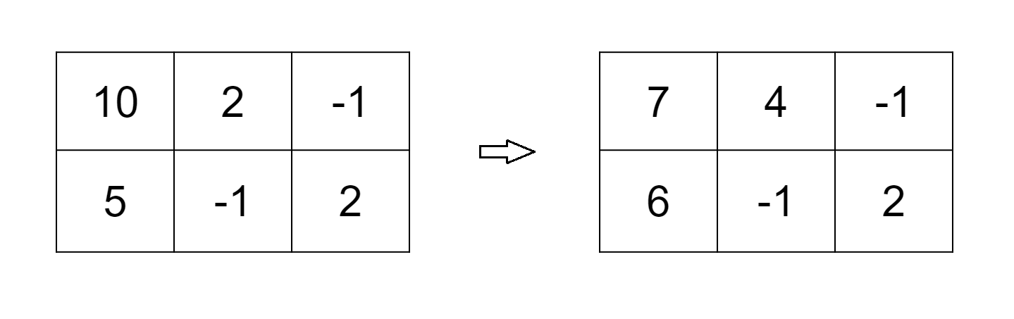 $R \times C$ 的平面上有一些城市,每天每個城市會向每個它相鄰的城市遷移 $\cfrac{\text{人數}}{k}$ 個人(整數除法,無條件捨去),請模擬出 $m$ 天之後的結果,輸出人數最少及最多的城市人數。