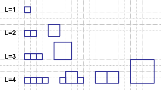 在一條長為 L 的通道上堆放正方形的貨品,正方形的邊長不可超過 L,且邊長皆為整數(最小邊長為 1),