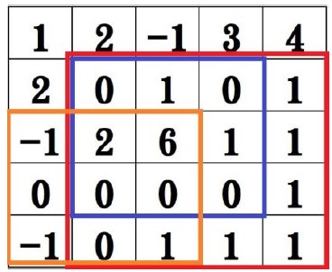 一位農夫買了一塊荒地,想要開墾成良田,但是後來發現開墾整塊土地的成本太高,而且荒地上可能會有他不想要砍掉的大樹,於是他決定只開墾部分的土地。首先,這塊荒地的長與寬均為 N 公尺,農夫將其等分為 N × N 格 1 公尺 × 1公尺的小方格,針對每一個方格農夫都會算出其開墾的成本開墾的總成本為所有要開墾方格的成本加總,還有如果該方格是大樹的話,農夫絕對不會將它納入開墾的範圍。農夫想要開墾出一塊正方形的農地,在給定開墾總預算 U 以及每一格整地成本的情況之下,算出農夫最多可以得到多大平方公尺的正方形良田。舉例而言:假設 N =5,U =10 土地資訊如下圖所示(如果該格的值為 -1表示為大樹,否則該值為開墾成本),最佳解為開墾藍色方格 ,因為開墾總預算為 1+2+6+1 10 至於紅色方格的開墾總預算為 1+1+2+6+1+1+1+1+1+1=16>10 、橘色方格包含大樹,所以都無法成為最佳解。
