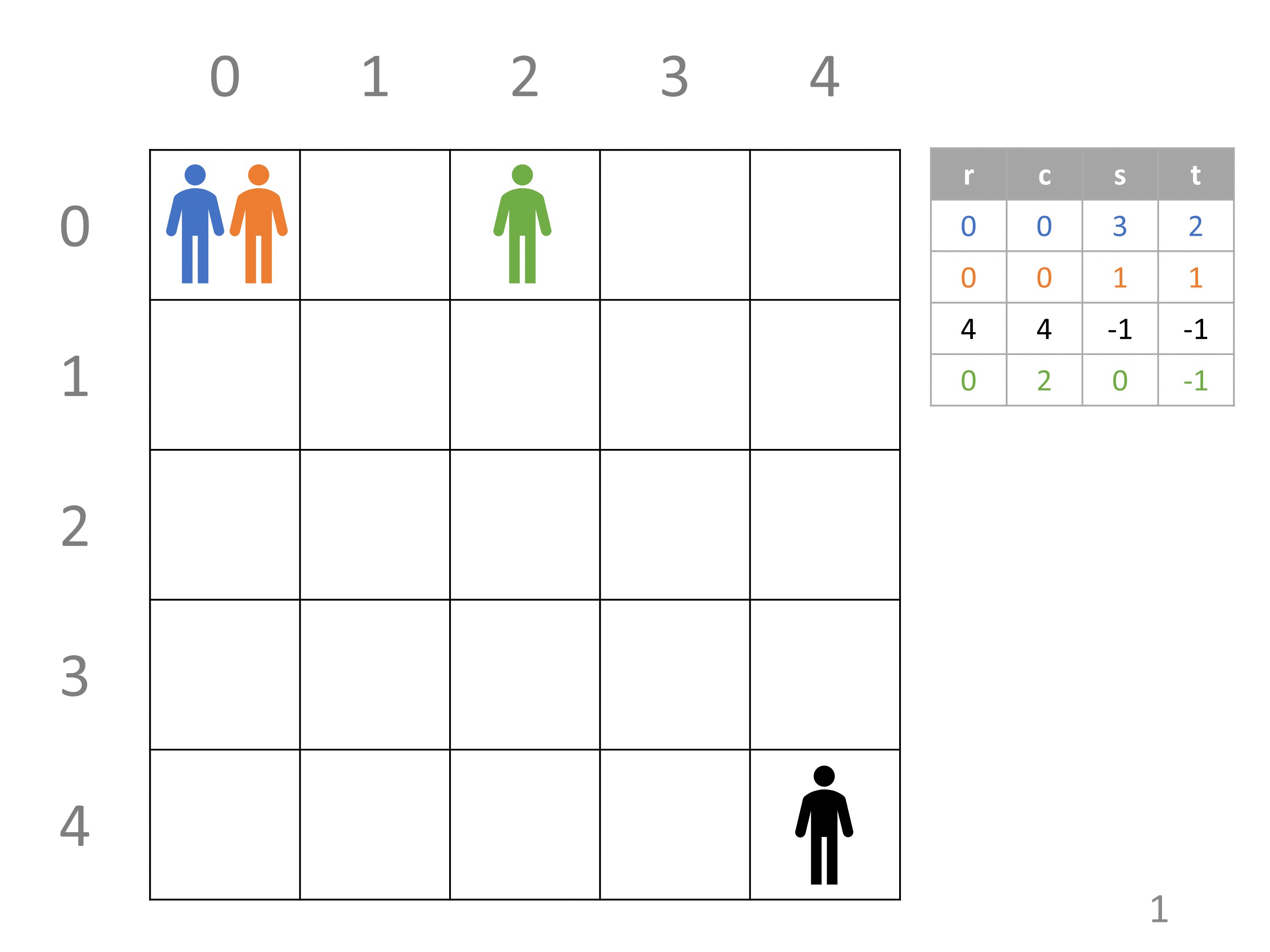 接下來有 $k$ 行,第 $i$ 行有四個整數 $r_i, c_i, s_i, t_i (0 \leq r < n, 0 \leq c < m)$