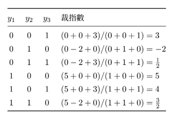 例如: $n = 3$ 而 $k = 4,w_1 = 5, w_2 = −2, w_3 = 3$ ,會有 $\frac{3(3 + 1)}{2} = 6$ 個小組,每個小組的裁指數如下表 :