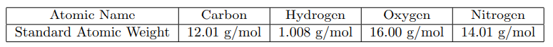 下表顯示了"C"、"H"、"O"、"N"的標準原子量