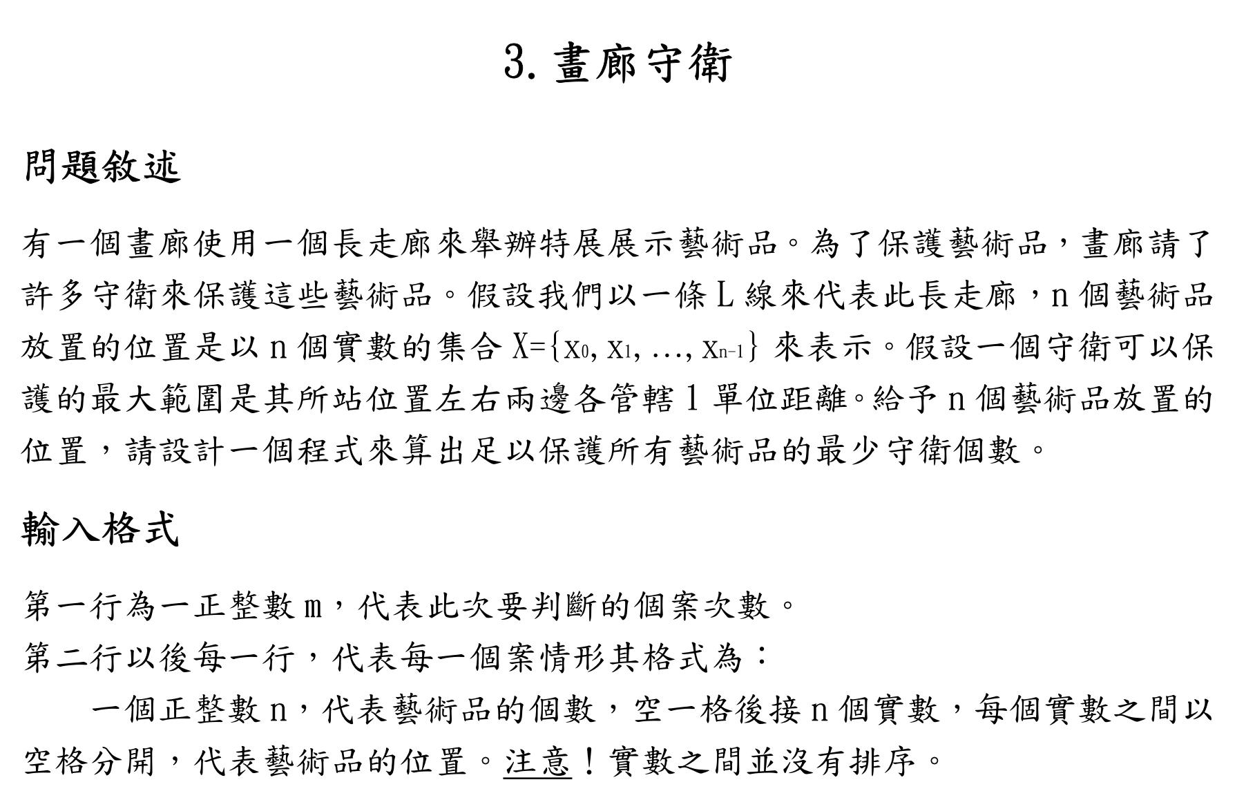 每筆測資第一個數字 N 代表之後有 N 個浮點數 xi,為掛畫的位置座標。
