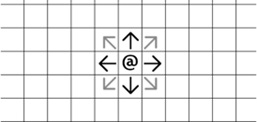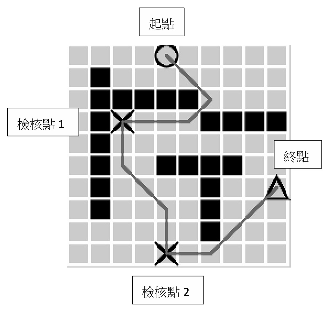 機器人 $\text{R2-D2}$ 正在一個棋盤格狀的地圖上移動並執行任務,地圖上會有些地方是 $\text{R2-D2}$ 無法越過的障礙物。$\text{R2-D2}$ 必需從起點出發並依序經過數個檢核點,最後到達終點才算完成任務。如下圖所示,$\text{R2-D2}$ 每一步可以向所在位子的八個方向任意移動,每一次移動都算走一步。請幫 $\text{R2-D2}$ 計算如果要成功完成任務,最少要移動的步數是幾步。給予的測試資料中,至少存在一條路徑來讓機器人完成任務。