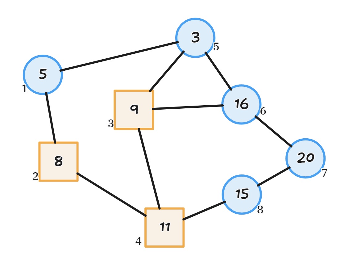 8 10 5 8 9 11 3 16 20 15 1 2 2 4 3 4 3 5 3 6 5 1 5 6 6 7 7 8 8 4 1 3 2 3 4