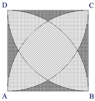 在下圖中,你可以看到一個正方形 ABCD,其中 AB = BC = CD = DA = a。以 A、B、C、D 四個頂點為中心,並以 a 為半徑,畫出了四條弧線。以 A 為中心畫的弧線從鄰近的頂點 B 開始,到另一個鄰近的頂點 D 結束。所有其他弧線也以類似的方式畫出。通過這種方式,形成了三種不同形狀的區域。你需要確定這些不同形狀區域的總面積。