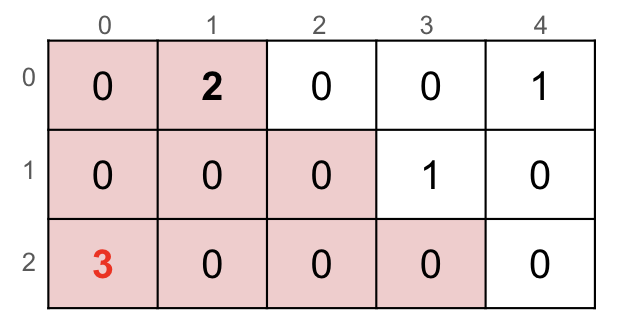 第一行有三個正整數 $M, N, q (2 \le M, N \le 500, 1 < q \le M \times N)$,接下來有 $M$ 行,每一行有 $N$ 個數字。保證炸彈半徑為正數的數量最多只有 $1500$ 個,且在場上的炸彈半徑不超過 $30$。