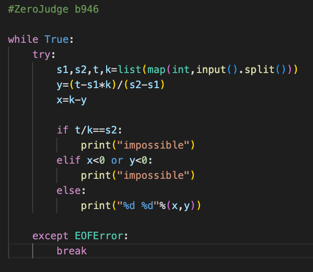 不難發現其實是二元一次方程式的題目 假設s1有x題,s2有y題 x+y=k s1*x + s2*y=T 移項後可得:y=(T-s1*K)/(s2 - s1) 但是我跑的秒數有6s,就無法通關了