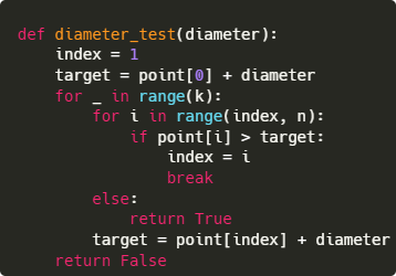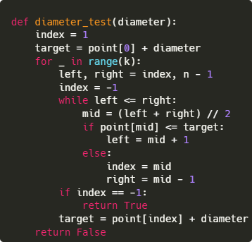 接著只要把陣列改成函式就好了(diameter_test是直徑的測試函式),另外如果k = 1時可以直接輸出最大範圍,到目前為止如果用線性搜的方式完成測試函式,大概可以得到0.6~0.7s的成績。