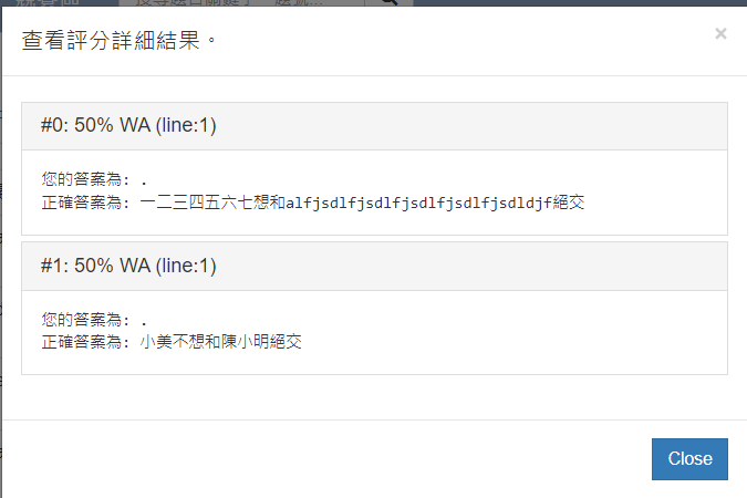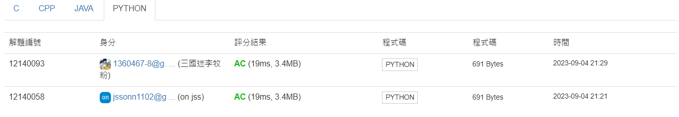 在你的題目 j329 中,測資點只有兩個,還有名字之間應該要有空格才可保證解題者的代碼是否完全正確,但我把你的測資拿出來後發現沒有做到這點