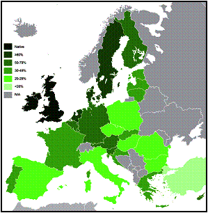 英文、西班牙文、德文、法文、義大利文及俄文為歐盟國家中最盛行的 6 種語言。左圖顯示英語人口在歐洲各國的密度。這些語言都有不同的字來表示英文的「HELLO」。例如西班牙文中等同於英文「HELLO」的字是「HOLA」,而德文、法文、義大利文及俄文中意思為(或相近)「HELLO」的字依序為「HALLO」、「BONJOUR」、「CIAO」和「ZDRAVSTVUJTE」。