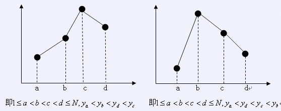 在完成了古越州圆盘密码的研究之后,考古学家小布来到了南美大陆的西部。相传很久以前在这片土地上生活着两个部落,一个部落崇拜闪电,另一个部落崇拜高山,他们分别用闪电和山峰的形状作为各自部落的图腾。小布的团队在山洞里发现了一幅巨大的壁画,壁画上被标记出了N个点,经测量发现这N个点的水平位置和竖直位置是两两不同的。小布认为这幅壁画所包含的信息仅与这N个点的相对位置有关,因此不妨设坐标分别为(1, y1) , (2, y2), ..., (n, yn),其中y1~yn是1~N的一个排列。小布的团队打算研究在这幅壁画中包含着多少个图腾,其中闪电图腾的定义图示如下(图腾的形式只与4个纵坐标值的相对大小排列顺序有关):