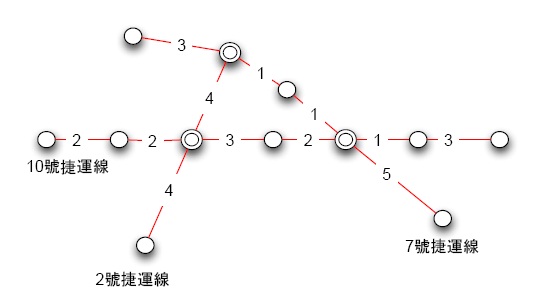 | 時間為: 1分鐘 (在捷運上等待離站) + 2分鐘 (到達2號站所需時間) + 1分鐘 (在捷運上等待離站) + 2分鐘 (到達 3號站所需時間) = 6分鐘。若以輸入範例第四個測資:12 7 2 1 10 1 為例,使用者於 12:07抵達 2號捷運線的 1號站,目的地為 10號線的 1號站,因此搭乘捷運所需的最短時間為:1分鐘 (12:10之捷運進站後搭上捷運並在捷運上等待離站) + 4分鐘 (到達 2號站所需時間) + 1分鐘 (2號線於 12:15到站後下車等待 12:18抵達的 10號線,上車並在捷運上等待離站) + 2分鐘 (到達10號線2號站所需時間) + 1分鐘 (在捷運上等待離站) + 2分鐘 (到達 10號線 1號站所需時間) = 11分鐘。 |