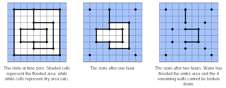 在剛開始時,整個座標平面是乾的。在時間0時,洪水瞬間地淹沒最外圍(沒有牆壁包圍的空間)。在正好一個小時後,每個牆壁若有一側是水而另一側是空氣的話,就會因水壓的關係而毀壞,洪水然後會淹沒任何沒有被牆壁完整包圍的新區域。這時,將又會有新的牆壁一側是水而另一側是空氣,再經過另一個小時後,這些牆壁也會毀壞而洪水繼續氾濫。這個過程將持續直到洪水淹沒整個區域為止。