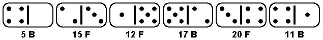 要注意的是骨牌在放置時,有正向及反向兩個方向。遊戲從左側開始,移除任何一對骨牌之後要回到最左邊。在本例中,由於 12 號骨牌 (正向) 及 17 號骨牌 (反向) 相接的點數都是 5 點,所以先行移除。