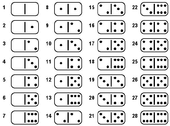 骨牌有一個流行的變化玩法,就是將一些 (隨機選取) 骨牌平放,一個一個頭尾相接,然後將兩個相接的點數相同 (由左至右尋找) 的骨牌移除。以下面六張骨牌為例。原本抽出了六張骨牌。