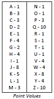 在一個頗受歡迎的棋盤遊戲中,參賽者們將字母填入棋盤內形成一個單字,每個單字的總分為其字母分數的總和