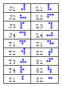 每一筆輸入有一個正整數N,之後有N個需要你來排列的方塊,其中方塊必為T、J、L、Z、S、I六種之一,並且這N筆輸入包含了方塊的方向(見圖),換句話說,你不用寫一個用來翻轉方塊的code。方塊不能重複使用。
