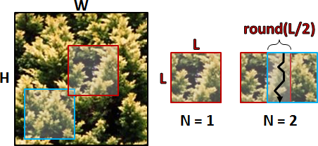 小正方形重疊一半的寬度(四捨五入)。於重疊區域當中,找到像素差異總和最小的路徑(兩個像素的顏色差異,設定為RGB的直線距離四捨五入),作為拼圖接縫(接縫及接縫以右,屬於新的小正方形)。起點在上緣某個像素,終點在下緣某個像素,每步只能走向「左下↙」、「下↓」、「右下↘」的相鄰像素,每步只能選擇其中一個方向前進。