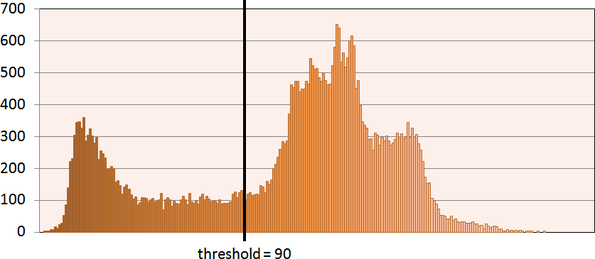 理想的臨界值,把直方圖切成左右兩側,左側盡量集中、右側盡量集中。外觀有如兩座山峰。