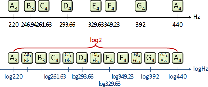 為了滿足這個規定,前面所謂的等分,其實不是頻率的間距相同,而是頻率取log之後的間距相同,間距是(log2)/12。由此可以得到音階頻率的數學公式:440 ⋅ 2n/12,n是各種整數。