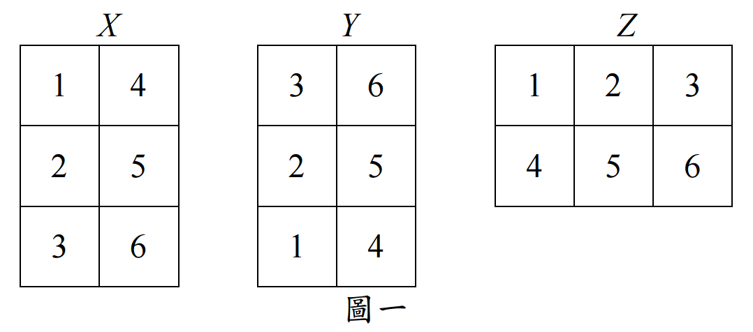 如圖一, 矩陣X 翻轉後可得到 Y ,將 矩陣Y 再旋轉後可得到 Z 。