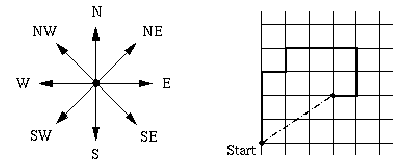 你的任務就是,給你一張「傳統」的地圖,請你寫一個程式算出藏寶的地點以及距離。地圖中的方向有8個,如下方左邊的圖所示。