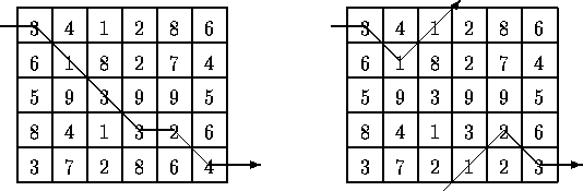 這兩個方陣的「最小重量路徑」( minimal-weight path )已經在上面分別標出來了。注意一下右邊的方陣,其利用了第一列和最後一列是相鄰的這個性質達到了最小的重量。