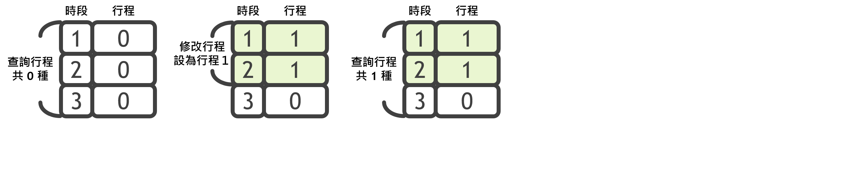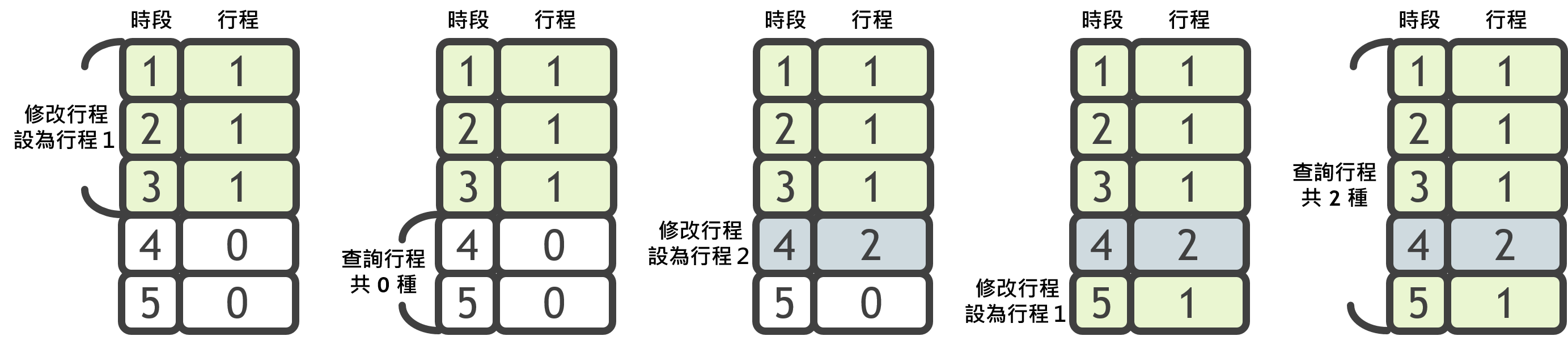 ①當 K = 1 時進行「修改行程」,接著 K 後面有3個整數 L 、 R 、 P ,代表將當日時段 [ L , R ] 的「行程代號」設為 P 。