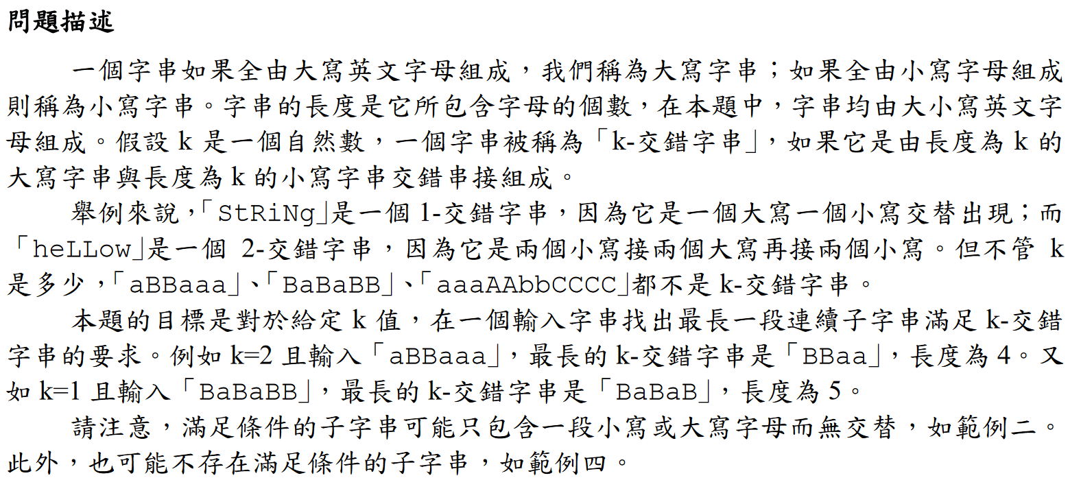 輸出輸入字串中滿足 k-交錯字串 的要求的最長一段連續子字串的長度,以換行結尾。